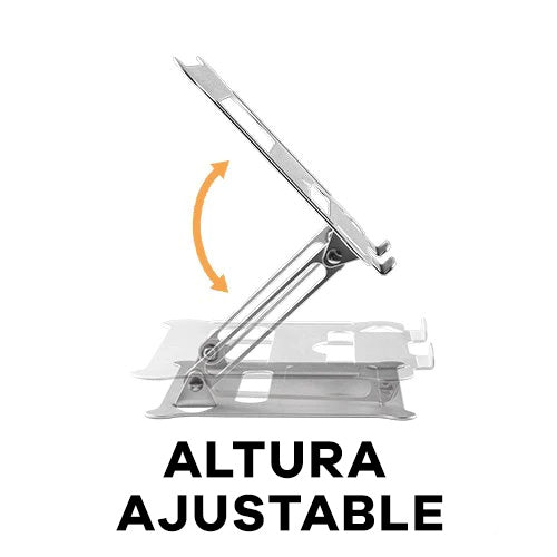 Ajustable en múltiples niveles, este soporte se adapta a cualquier usuario y laptop. Su estructura plegable y liviana permite llevarlo a cualquier lugar, asegurando confort y estabilidad en todo momento.